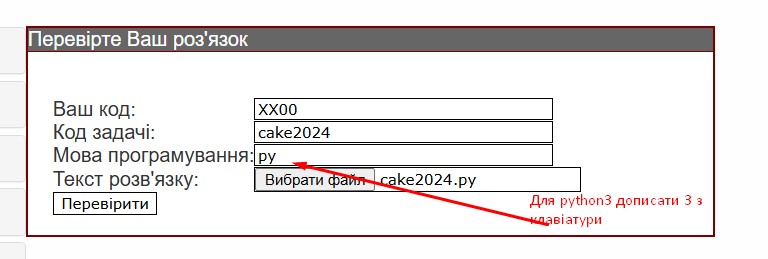 3.При перевірці онлайн чи надсиланню розв'язку на офіційну перевріку файл з кодом розв'язку повтнен мати назву, таку як назва задачі та стандартне розширення для даної мови програмування. Тоді система правильно заповнить форму надсилання автоматично.